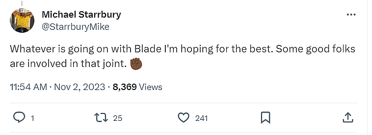 In a subsequent post, Starrybury wrote, “Whatever is going on with Blade I’m hoping for the best. Some good folks are involved in that joint.”