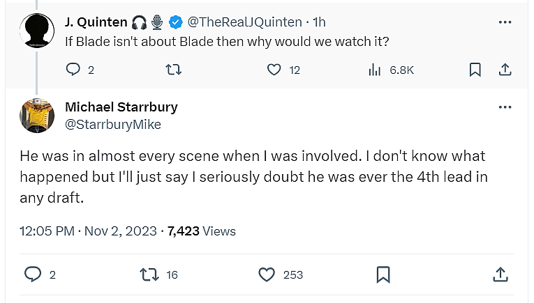 In response to a user questioning, “If Blade isn’t about Blade then why would we watch it?” Starrbury said, “He was in almost every scene when I was involved. I don’t know what happened but I’ll just say I seriously doubt he was ever the 4th lead in any draft.”