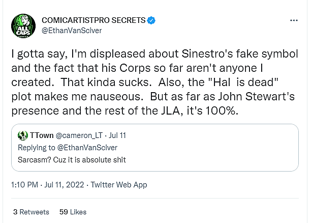 EVS explained his position in detail and gave his followers a few spoilers in the process. “I gotta say, I’m displeased about Sinestro’s fake symbol and the fact that his Corps so far aren’t anyone I created,” he began.