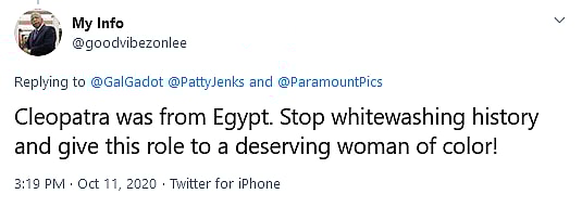 @Goodvibezonlee summed up the argument’s of Gadot’s critics succinctly, as they demanded that the film “stop whitewashing history and give this role to a deserving woman of color!”