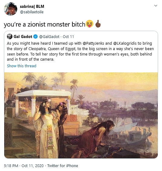 They added, “anyway i have to get back to work but f*** zionists, f*** Gal Gadot, and put some respect on Cleopatra.”