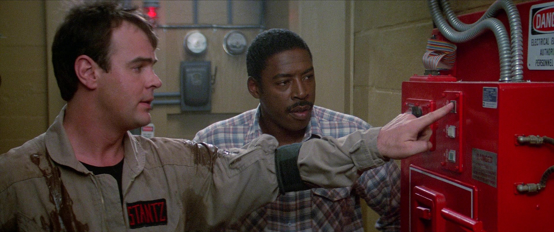 Ray Stantz (Dan Aykroyd) teaches Winston Zeddemore (Ernie Hudson) the ropes in Ghostbusters (1984), Columbia Pictures