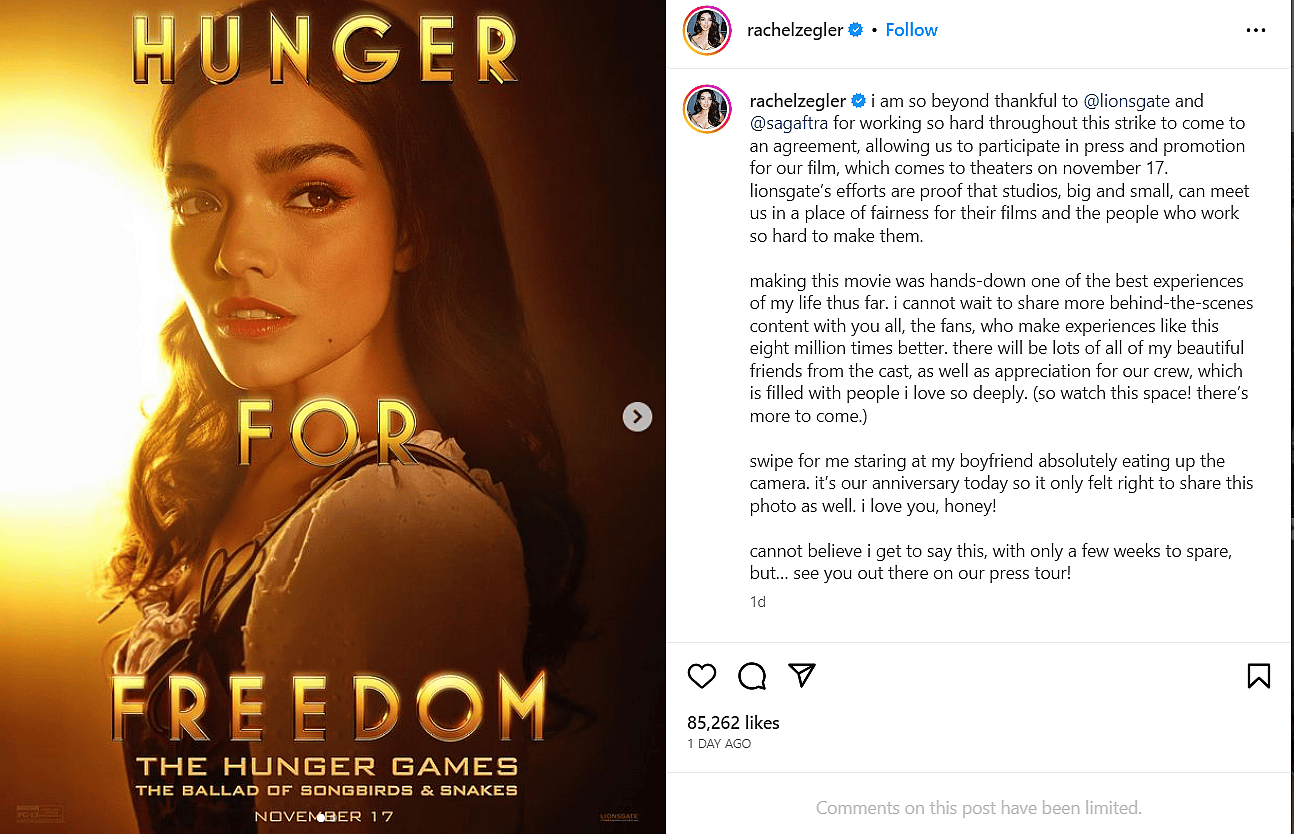 Zegler, who plays Lucy Gray Baird in the film, posted to Instagram about being able to promote the film, “I am so beyond thankful to Lionsgate and SAG-AFTRA for working so hard throughout this strike to come to an agreement, allowing us to participate in press and promotion for our film, which comes to theaters on november 17.”