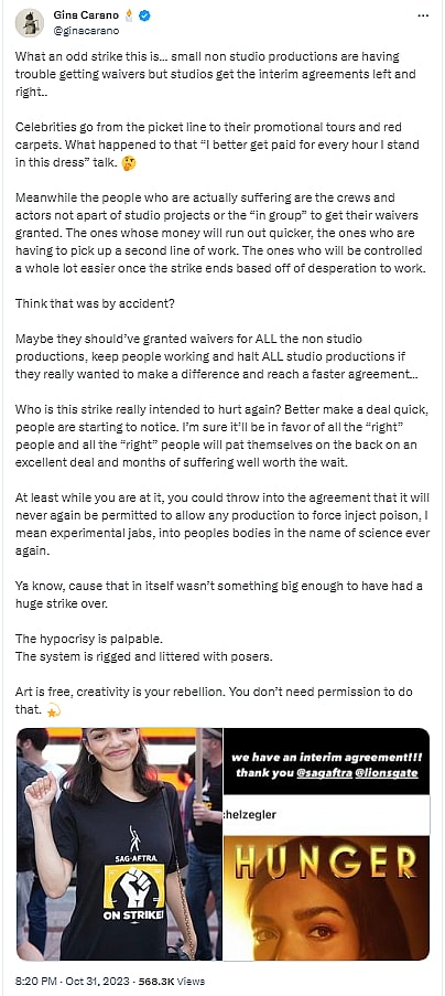 Carano then stated, “Meanwhile the people who are actually suffering are the crews and actors not apart of studio projects or the ‘in group’ to get their waivers granted. The ones whose money will run out quicker, the ones who are having to pick up a second line of work. The ones who will be controlled a whole lot easier once the strike ends based off of desperation to work.”