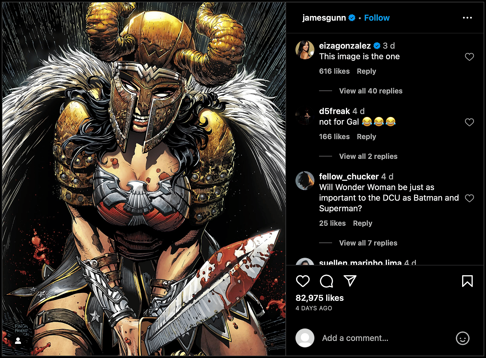 Wishing everyone a “Happy Wonder Woman Day,” Gunn posted the cover art of Wonder Woman #38 by David Finch. In the issue, Diana steps in for her brother Ares in desperation and becomes the God of War, which the cover makes fairly evident. González replied to the post, remarking on the art, “This image is the one.”