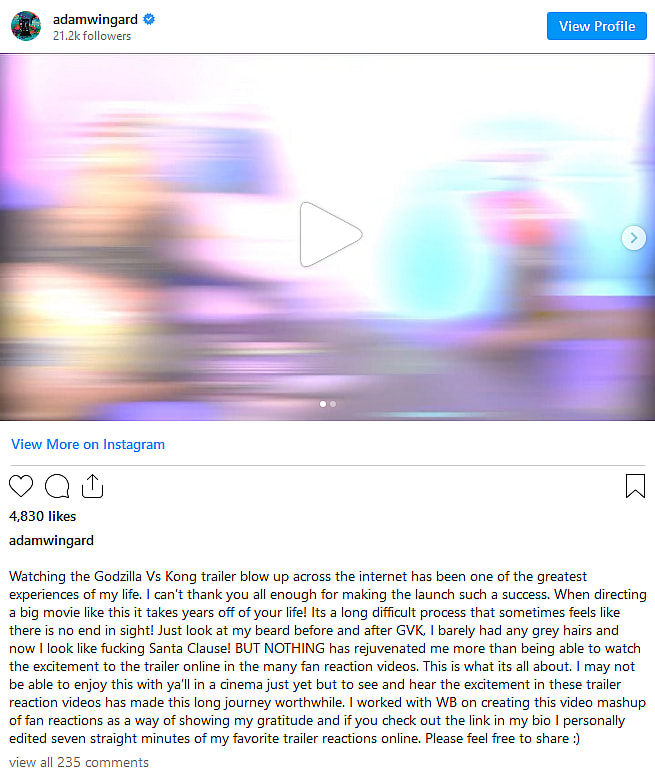 Now Warner Bros.’ most-watched trailer ever, with the upload on their channel currently sitting at over 52 million views, Wingard expressed his gratitude towards excited fans in a lengthy and ebullient Instagram post.