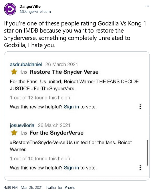 “If you’re one of these people rating Godzilla Vs Kong 1 star on IMDB because you want to restore the Snyderverse, something completely unrelated to Godzilla, I hate you,” they wrote.