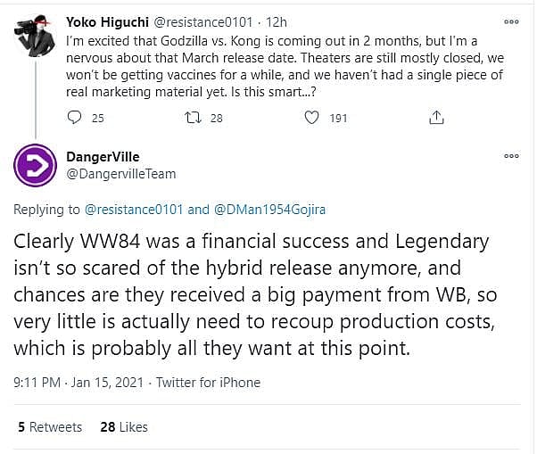 “Clearly WW84 was a financial success and Legendary isn’t so scared of the hybrid release anymore, and chances are they received a big payment from WB, so very little is actually need to recoup production costs, which is probably all they want at this point,” wrote DangerVille’s team.