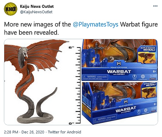 As presented on Kaiju News Outlet’s Twitter page, courtesy of the Playmates toy line based on the film, we now have new images of Godzilla vs Kong’s terrifying serpent kaiju, the Warbat.