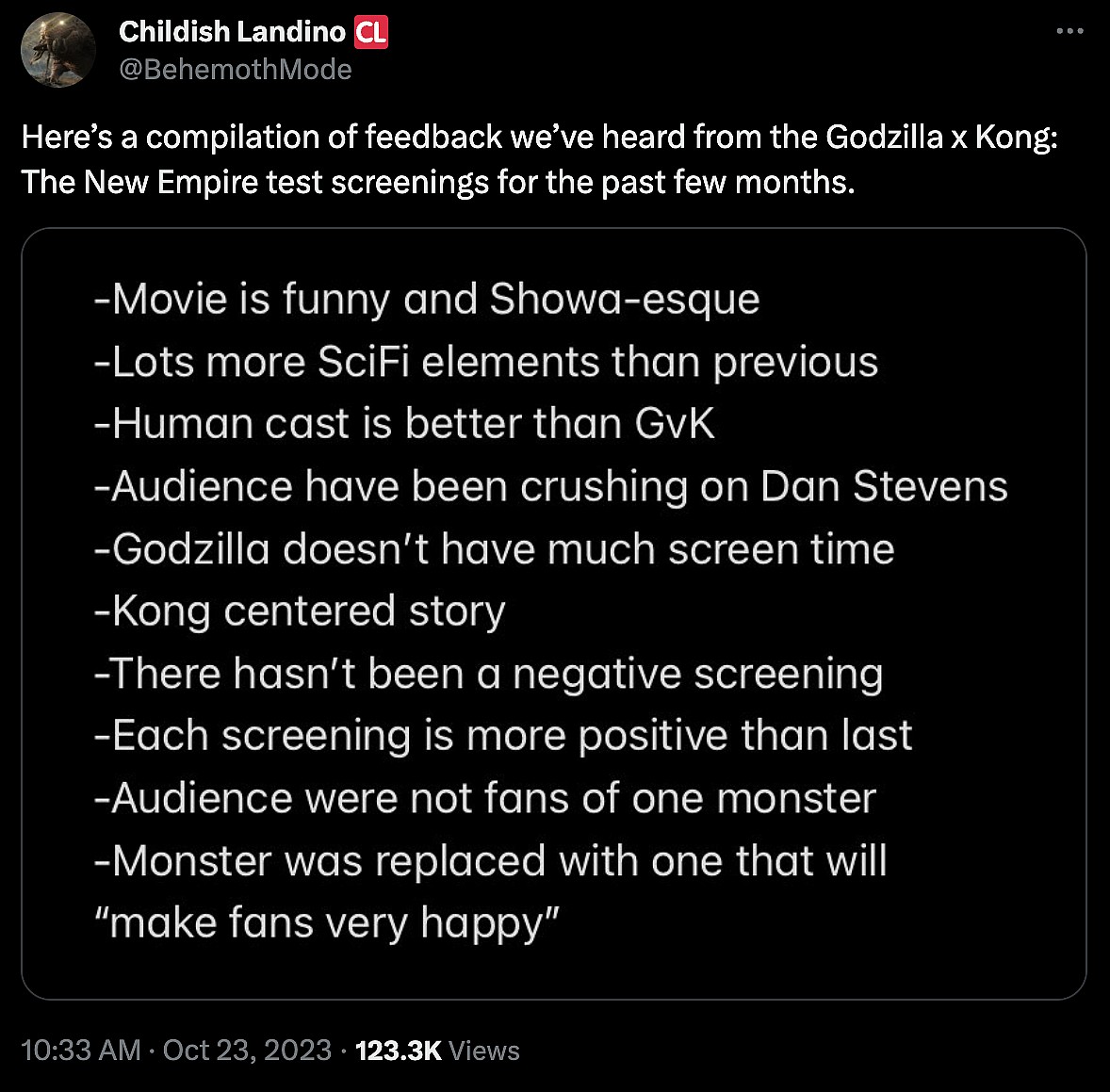Other notable reactions from the GxK test screening include “the human cast is better,” especially Dan Stevens who may develop a smitten following from things. There have been a few screenings, none negative, although an unidentified monster was deemed unlikable and replaced. We have no word if this last bit is about antagonists Shimu or Scar King.