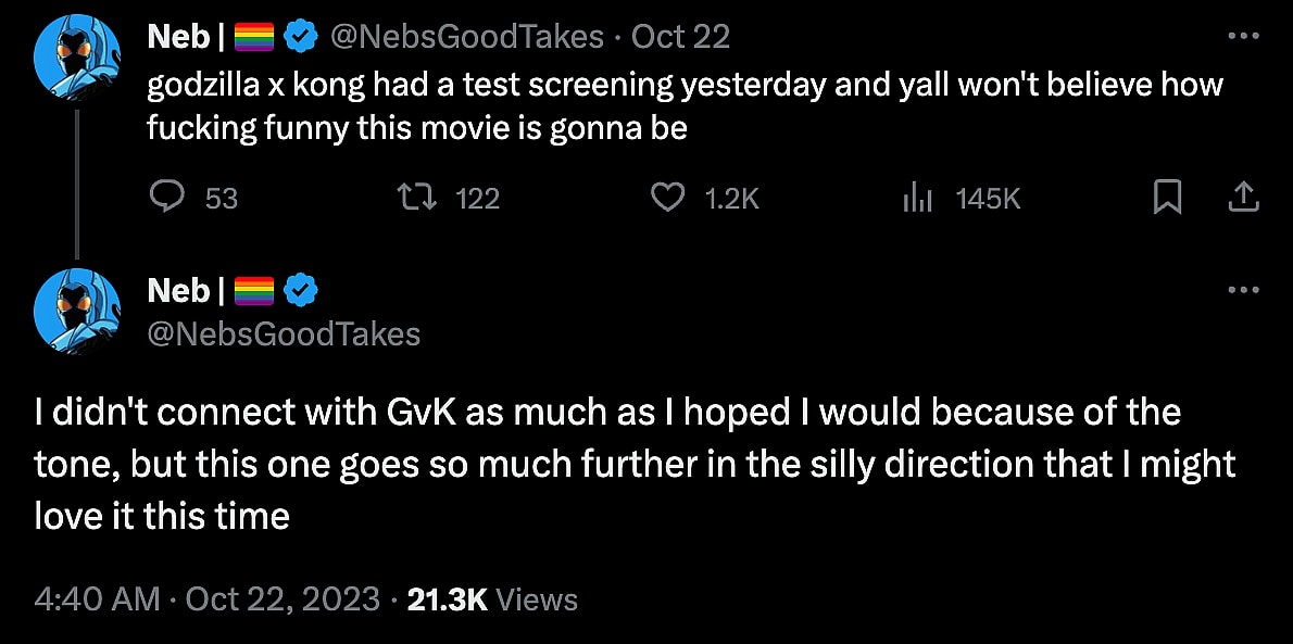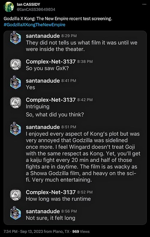 This fortune might not favor the reportedly long runtime or those sitting through it, but other reviewers were invested, regardless. “[Ya’ll] won’t believe how…funny this movie is gonna be,” went one user. “I didn’t connect with GvK as much as I hoped I would because of the tone,” which was lighter than most MonsterVerse entries.