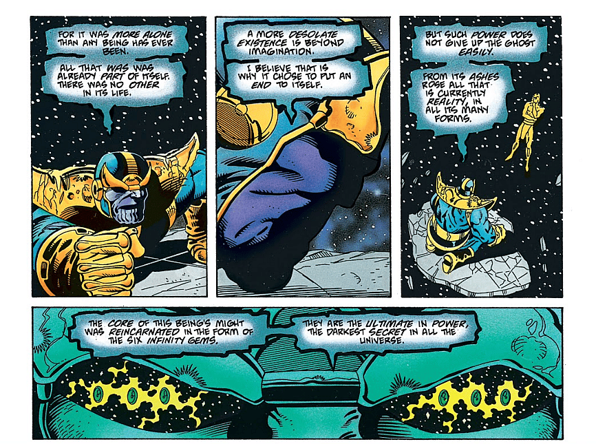 In The Thanos Quest #2 more details would be revealed by Thanos about the origin of the Infinity Gems. He said, “The gems come from before all recorded time. They were once a single unit, a lone entity. They were a sentient being of limitless power. At the time, this being was the only living thing that existed within any and all realities. It was all that was and all that was was it. That being was infinity and forever. No one would fault you if you were to call it God. What other name would fit? But I doubt it ever had a name or any use for one.”