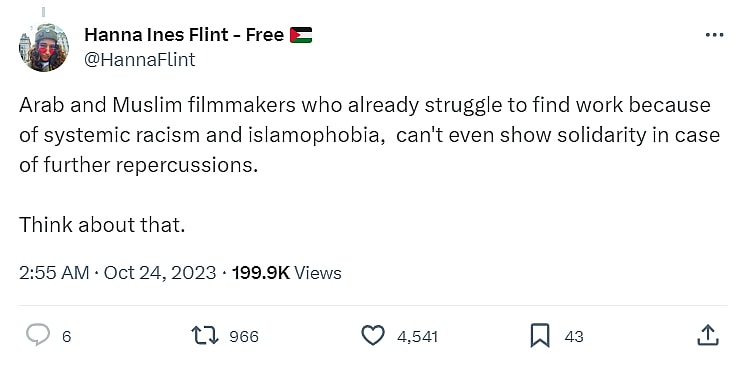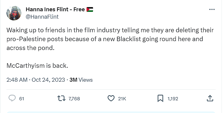 First Film Club podcast host Hanna Ines Flint took to X to share, “Waking up to friends in the film industry telling me they are deleting their pro-Palestine posts because of a new Blacklist going round here and across the pond.”
