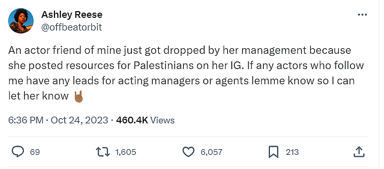 X user Ashley Reese also posited, “An actor friend of mine just got dropped by her management because she posted resources for Palestinians on her IG. If any actors who follow me have any leads for acting managers or agents lemme know so I can let her know ”