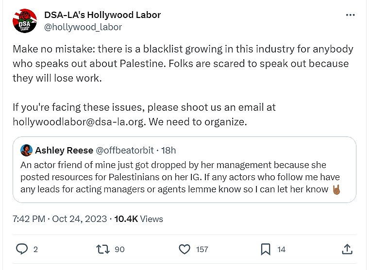 The organization posted, “Make no mistake: there is a blacklist growing in this industry for anybody who speaks out about Palestine. Folks are scared to speak out because they will lose work. If you’re facing these issues, please shoot us an email at [email protected]. We need to organize.”