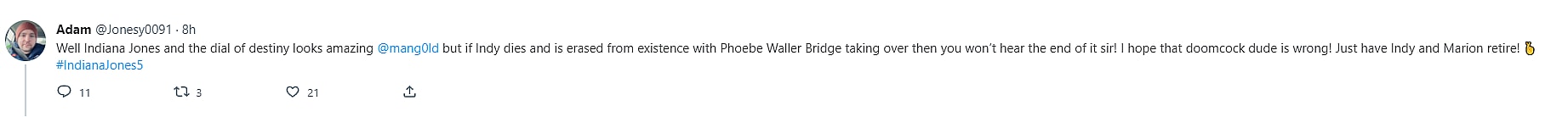In a now-deleted tweet, the user wrote, “Well Indiana Jones and the dial of destiny looks amazing James Mangold but if Indy dies and is erased from existence with Phoebe Waller Bridge taking over then you won’t hear the end of it sir!”