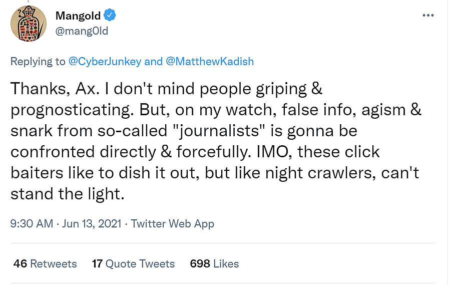 He wrote, “Thanks, Ax. I don’t mind people griping & prognosticating. But, on my watch, false info, agism & snark from so-called ‘journalists’ is gonna be confronted directly & forcefully.”