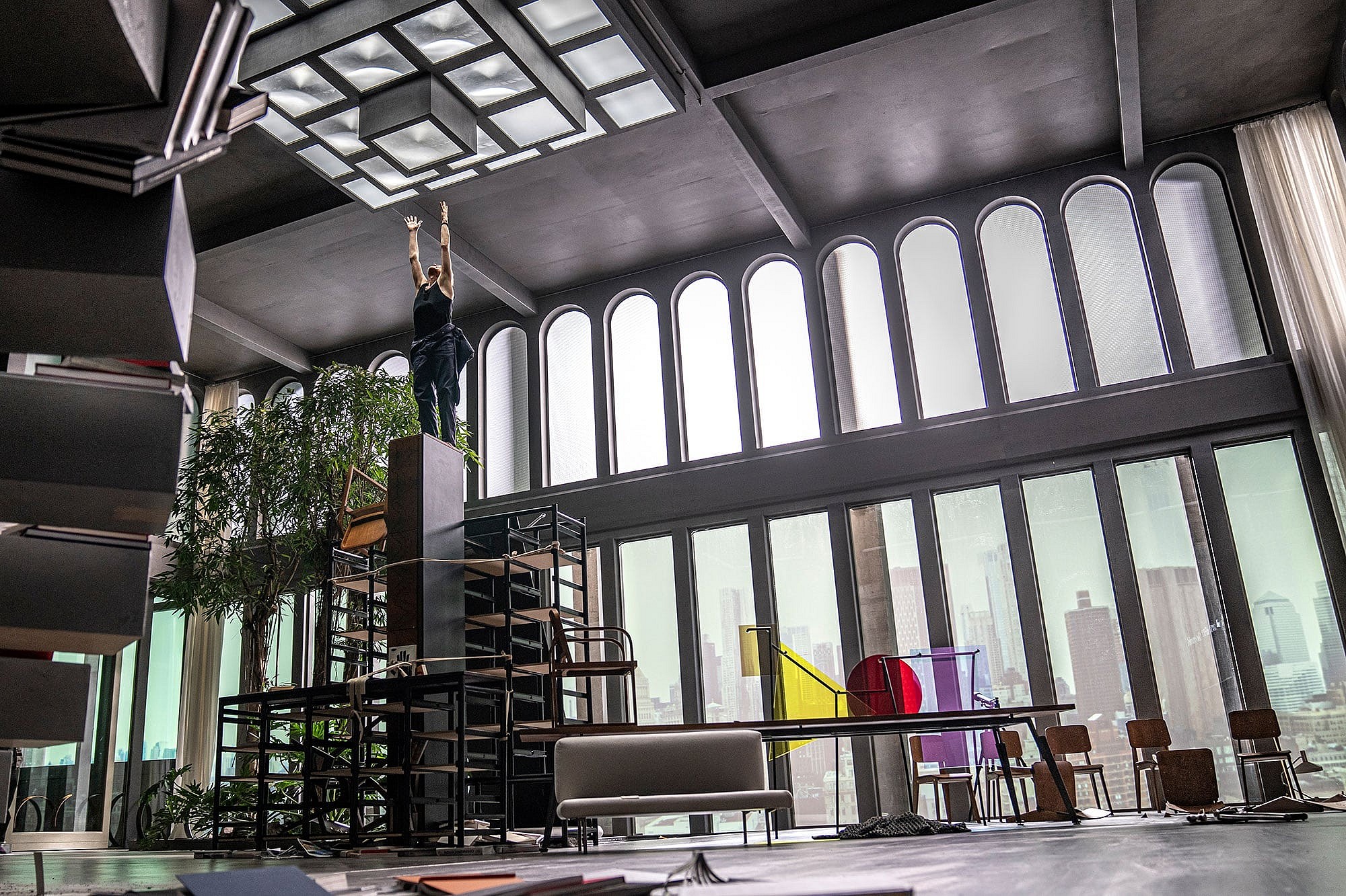 In an attempt to reach a glass panel in the ceiling, he builds a tower out of shelves, couches, and whatever other furniture he can find. Left with no other options, he leaves a mountain of feces just sitting in the apartment.