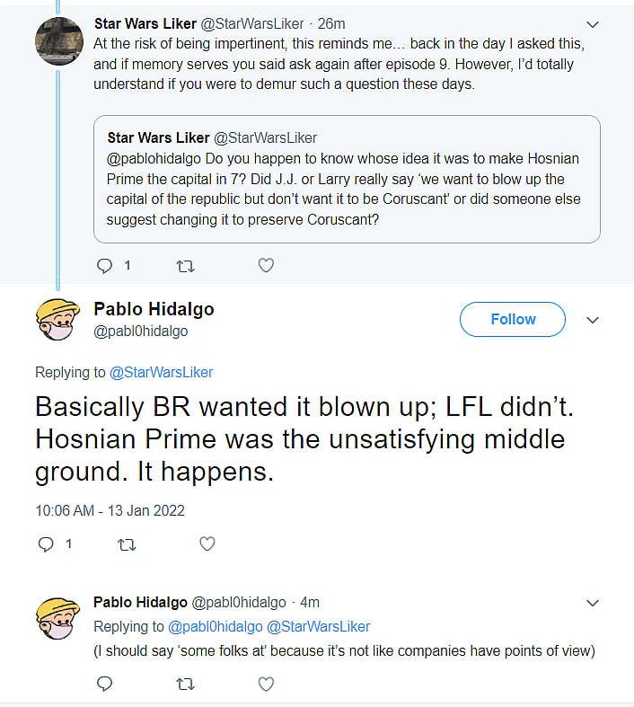 What do you make of this revelation that Hosnian Prime was created as a stand-in for Coruscant and the fact that Pablo Hidalgo is now openly criticizing Disney’s sequel trilogy?