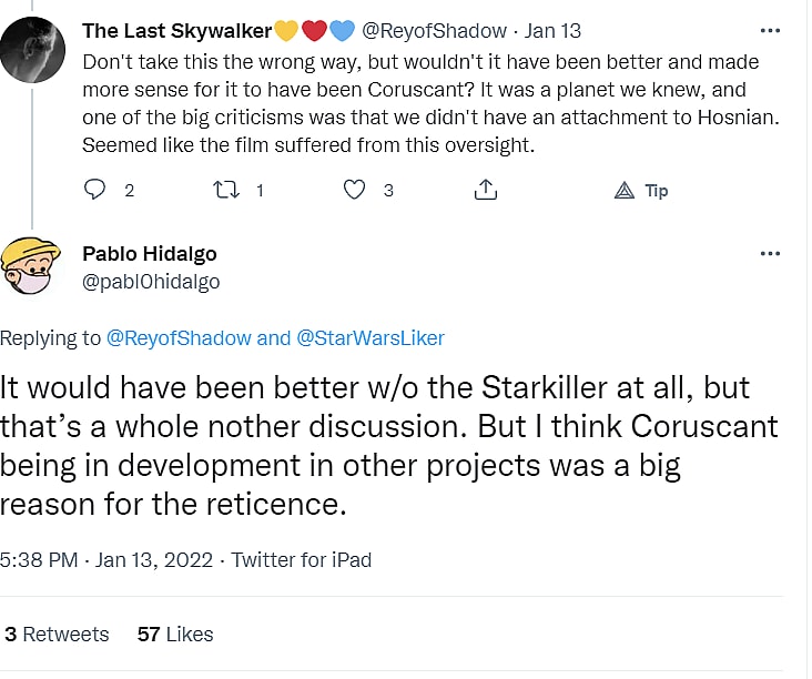 “It would have been better w/o the Starkiller at all, but that’s a whole nother discussion. But I think Coruscant being in development in other projects was a big reason for the reticence,” Hidalgo tweeted.