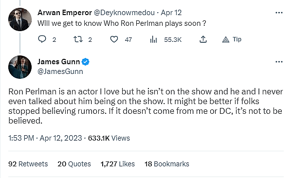 “Ron Perlman is an actor I love but he isn’t on the show and he and I never even talked about him being on the show,” the filmmaker answered. “It might be better if folks stopped believing rumors. If it doesn’t come from me or DC, it’s not to be believed.” Gunn’s had to clear the air similarly regarding Superman casting.