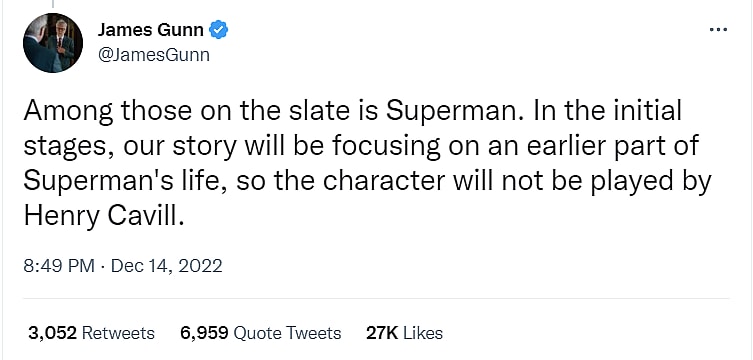 The confirmation comes after Gunn announced he would no longer have Henry Cavill continue in the role of Superman despite Warner Bros. Pictures having Cavill return for a cameo role in Black Adam as well as Cavill announcing he would be returning to the role in future films.