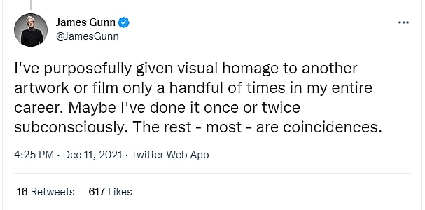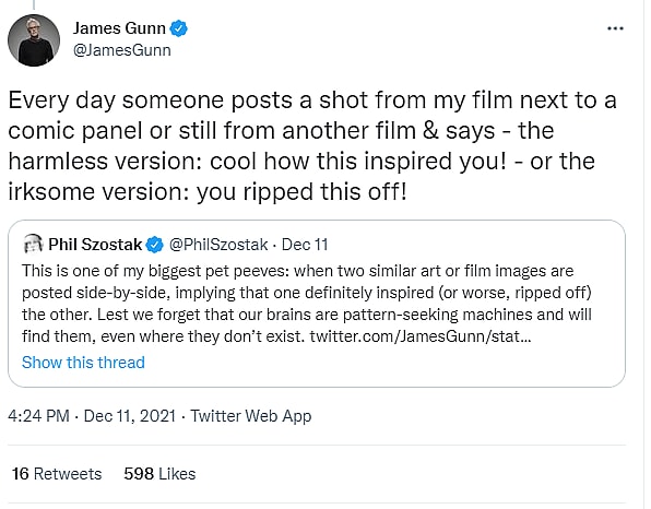 Gunn replied, “Every day someone posts a shot from my film next to a comic panel or still from another film & says – the harmless version: cool how this inspired you! – or the irksome version: you ripped this off!”