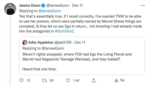 In a subsequent tweet, Gunn responded to another user who asked, “Weren’t rights swapped, where FOX had Ego the Living Planet and Marvel had Negasonic Teenage Warhead, and they traded? Heard that one time.”