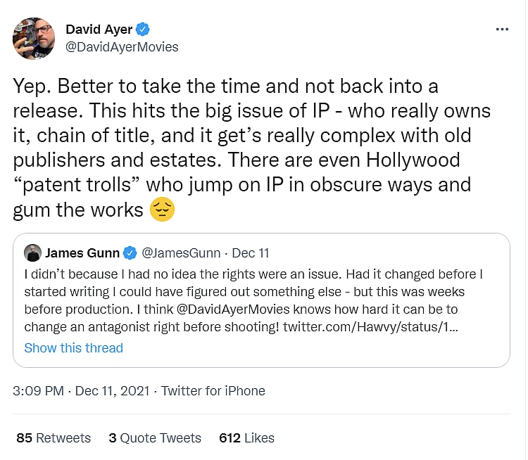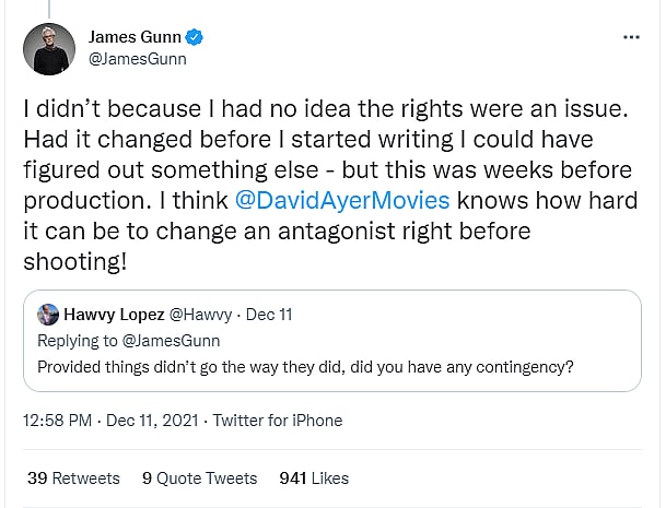 Gunn added, “I think David Ayer knows how hard it can be to change an antagonist right before shooting!”