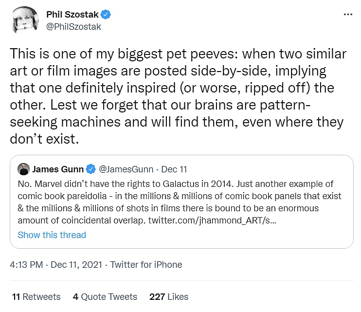 He added, “Just another example of comic book pareidolia – in the millions & millions of comic book panels that exist & the millions & millions of shots in films there is bound to be an enormous amount of coincidental overlap.”
