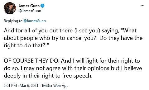 Back in March 2021, as part of a lengthy thread regarding free speech and whether films, TV, books, and even actors and directors should be cancelled, Gunn wrote, “And for all of you out there (I see you) saying, ‘What about people who try to cancel you?! Do they have the right to do that?!'”