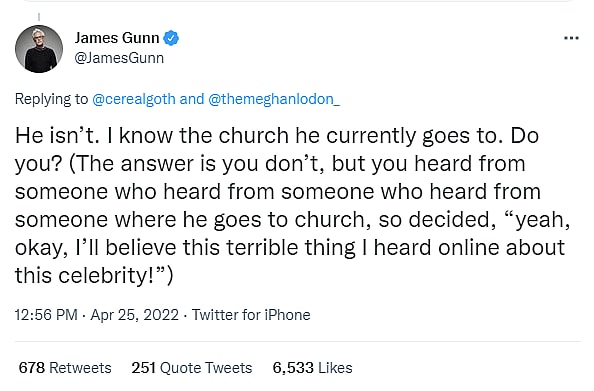 Gunn would also respond to a user who has since protected his tweets. The director wrote, “He isn’t. I know the church he currently goes to. Do you? (The answer is you don’t, but you heard from someone who heard from someone who heard from someone where he goes to church, so decided, ‘yeah, okay, I’ll believe this terrible thing I heard online about this celebrity!’)”