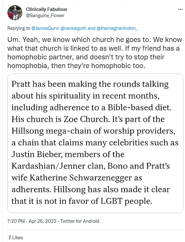 Gunn saw himself accused of homophobia alongside Pratt by one user who wrote, “Um. Yeah, we know which church he goes to. We know what that church is linked to as well. If my friend has a homophobic partner, and doesn’t try to stop their homophobia, then they’re homophobic too.”