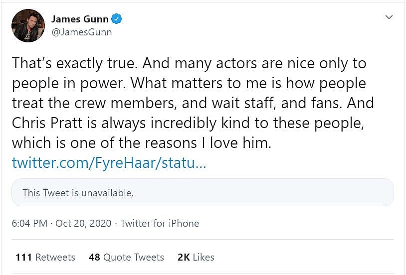 Gunn would defend Pratt when one user called for Pratt to be replaced tweeting, “Marvel. Hear me out. Just… replace him.”