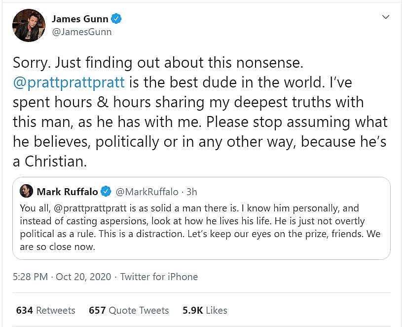 Gunn wrote on Twitter, “Sorry. Just finding out about this nonsense. Chris Pratt is the best dude in the world. I’ve spent hours & hours sharing my deepest truths with this man, as he has with me.”