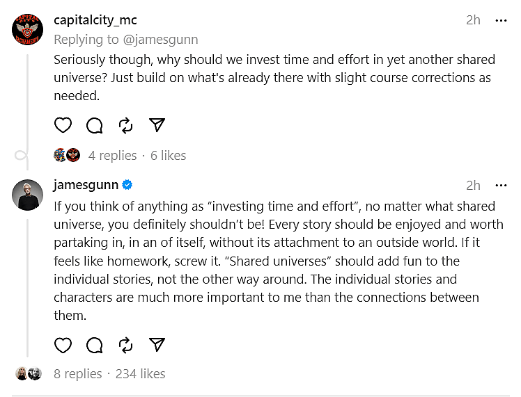 He would also address another user who balked at the idea of resetting the previous DCEU that began with Man of Steel. The user stated, “Seriously though, why should we invest time and effort in yet another shared universe? Just build on what’s already there with slight course corrections as needed.”