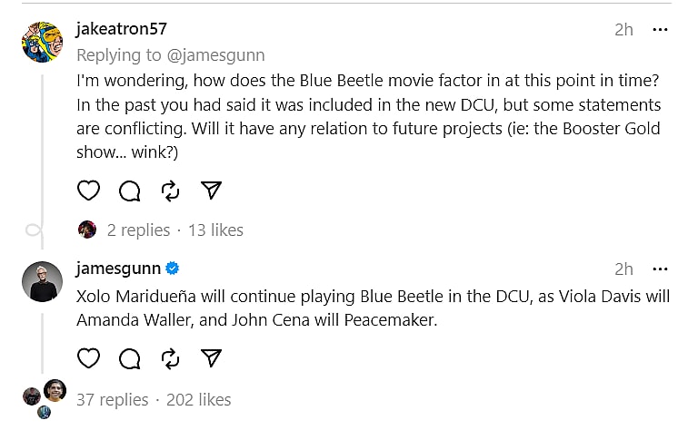Gunn would also provide clarity regarding Blue Beetle. A user asked, “I’m wondering, how does the Blue Beetle movie factor in at this point in time? In the past you had said it was included in the new DCU, but some statements are conflicting. Will it have any relation to future projects (ie: the Booster Gold show… wink?)”