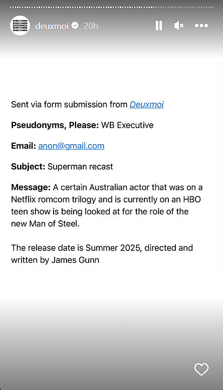 Nearly, a month later an anonymous rumor published by Hollywood gossip site Deuxmoi on Instagram claimed that, “A certain Australian actor that was on a Netflix romcom trilogy and is currently on an HBO teen show is being looked at for the role of the new Man of Steel.”
