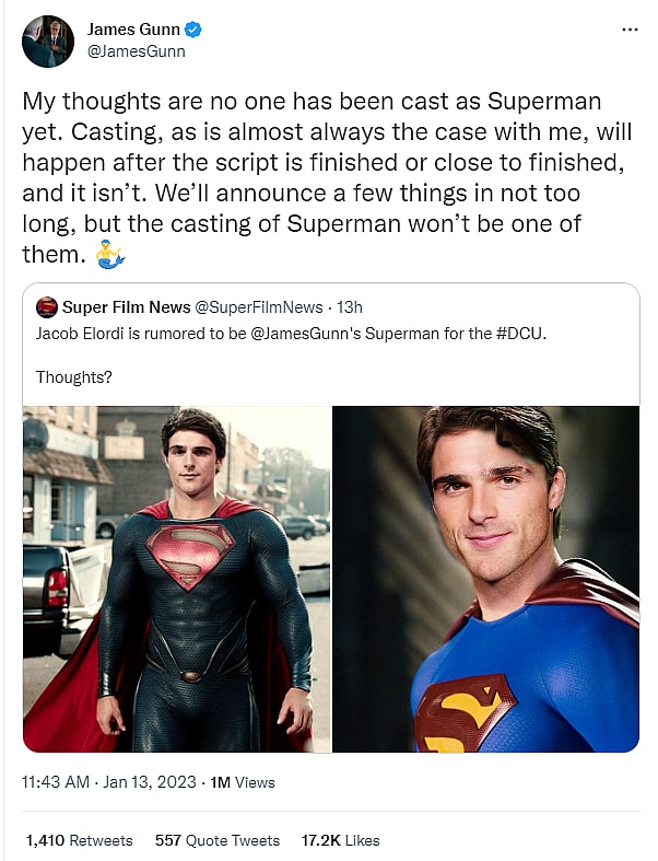 Gunn responded to the rumor writing on Twitter, “My thoughts are no one has been cast as Superman yet. Casting, as is almost always the case with me, will happen after the script is finished or close to finished, and it isn’t.”