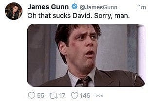 maybe this is a draft tweet that sent today? Looks similar to a tweet (without gif) Gunn sent on July 10 — 9 days before he went silent on Twitter. https://t.co/LWU0LplDZs