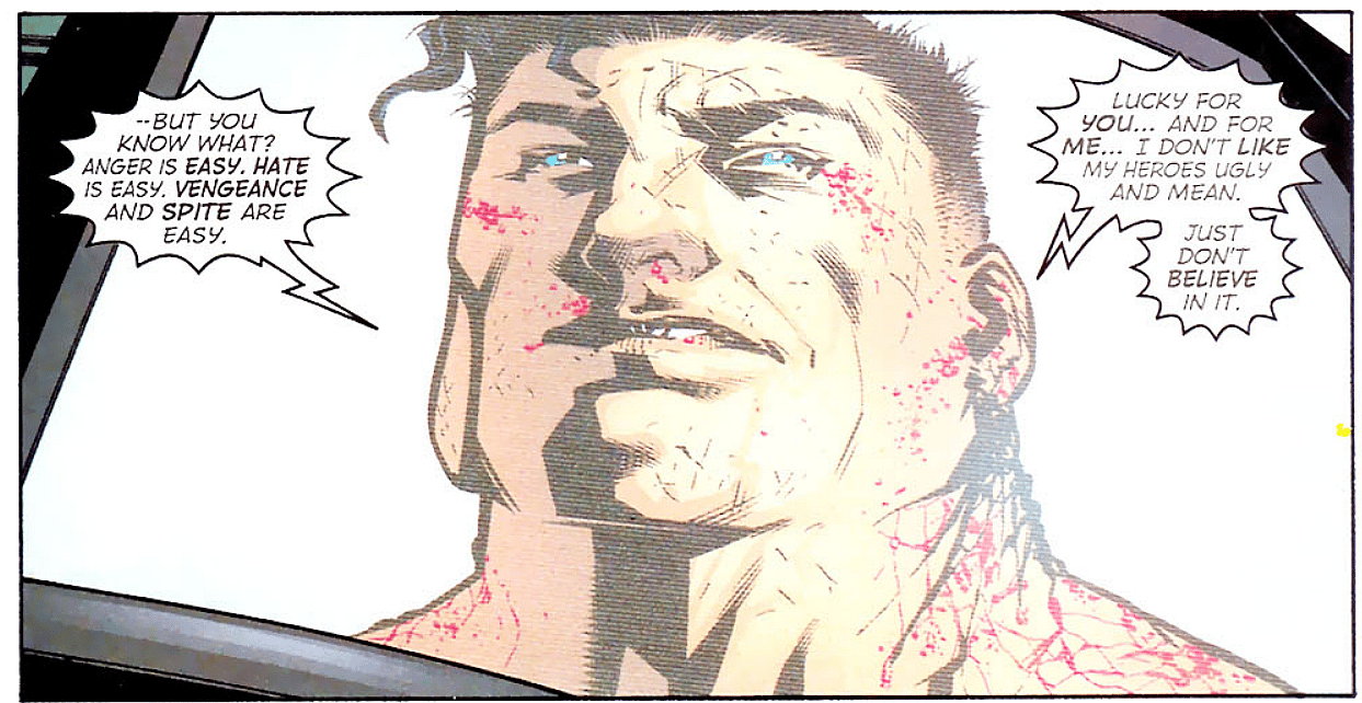 Superman stands against them and offers another path that includes mercy. However, after they attempt to murder him, Superman makes it look like he’s crossed the line and has adapted their tactics. However, it’s all a ruse and he keeps to his principles telling Black, “Anger is easy. Hate is easy. Vengeance and spite are easy. Lucky for you… And for me… I don’t like my heroes ugly and mean. Just don’t believe in it.”