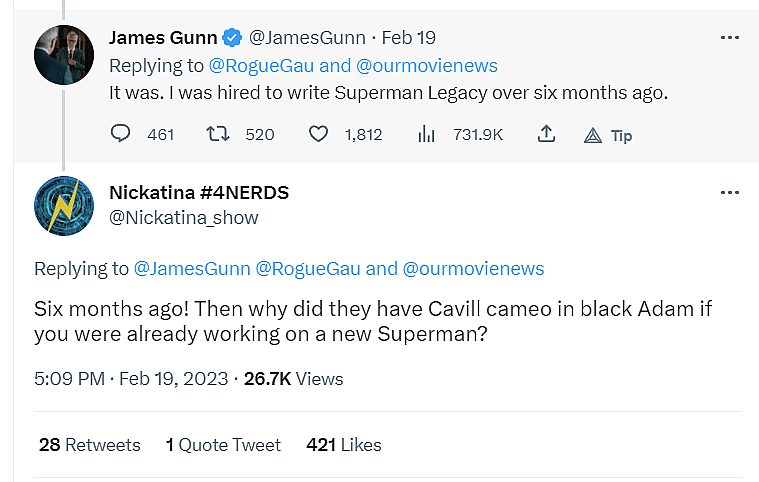Another asked, “Six months ago! Then why did they have Cavill cameo in black Adam if you were already working on a new Superman?”