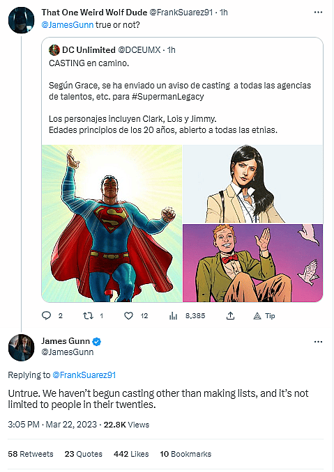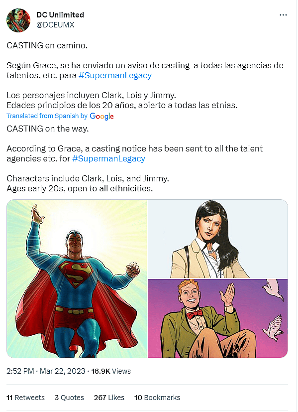 Twitter user DCEUMX picked up the rumor and ran with it writing via a translation from Google, “CASTING on the way. According to Grace, a casting notice has been sent to all the talent agencies etc. for Superman: Legacy. Characters include Clark, Lois, and Jimmy. Ages early 20s, open to all ethnicities.”