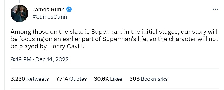 He wrote on Twitter, “In the initial stages, our story will be focusing on an earlier part of Superman’s life, so the character will not be played by Henry Cavill.”
