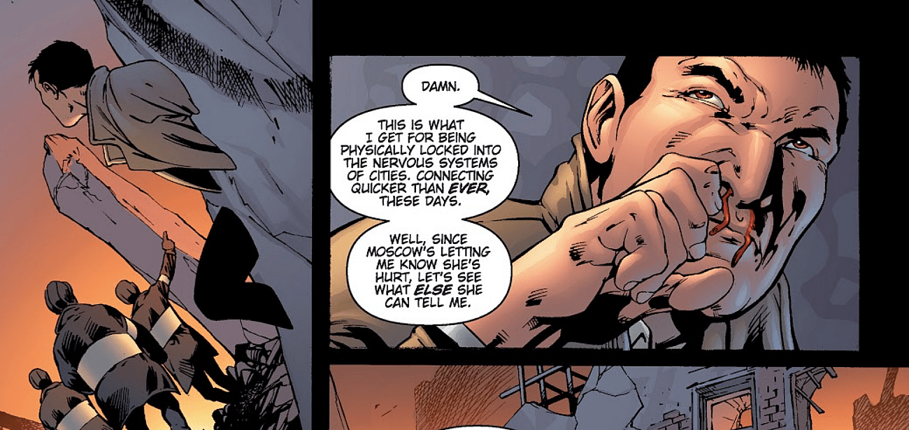 Hawksmoor first appeared in StormWatch #37 and would go on to become one of the founding members of The Authority. His abilities allows him to communicate with urban cities and he can also phase through urban areas allowing him to pass through the ground or walls. His connection with urban areas also allows him to see everything that is happening in the city in real time.