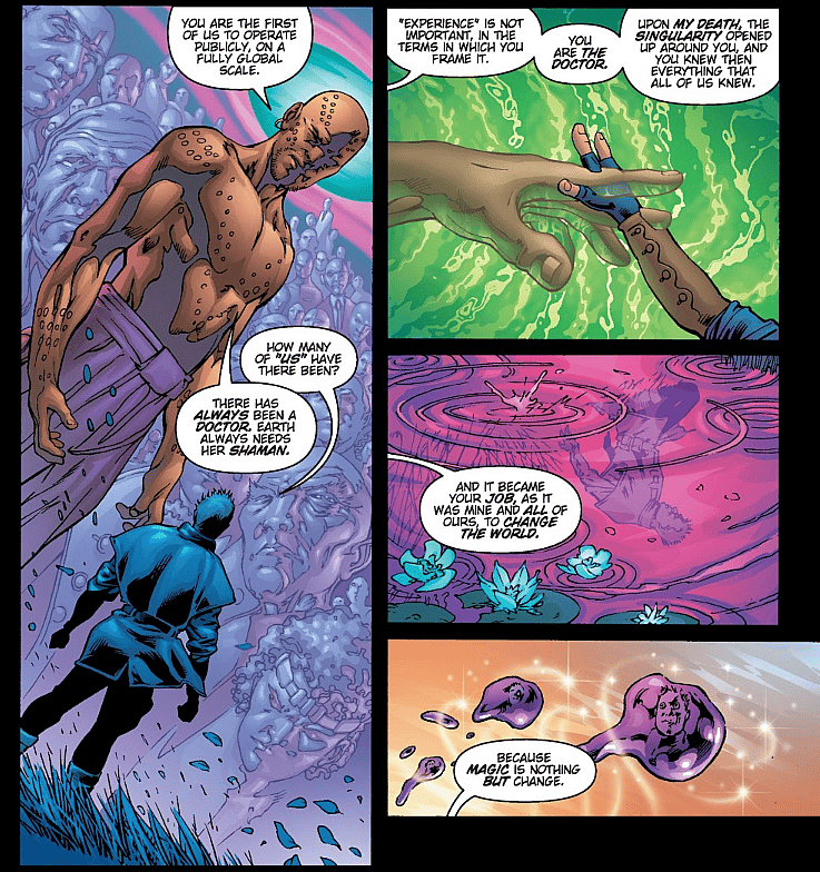 As for The Doctor, the original version was Jeroen Thornedike, who was introduced in The Authority #1 as the heir to a group of magical beings calling themselves shamans that have the ability to manipulate magic and whose job is “to change the world” through the use of magic.