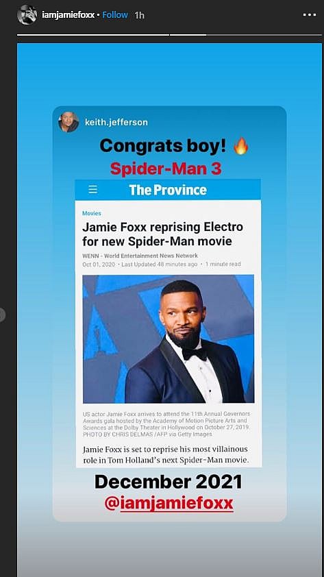 Foxx would seemingly confirm the rumors on Instagram. He first posted a photo of actor Keith Jefferson congratulating him on the role for the untitled third Spider-Man film.