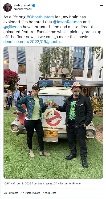 “As a lifelong #Ghostbusters fan, my brain has exploded,” he wrote. “I’m honored that Jason Reitman and Gil Kenan have entrusted Jenn and me to direct this animated feature! Excuse me while I pick my brains up off the floor now so we can go make this movie.”