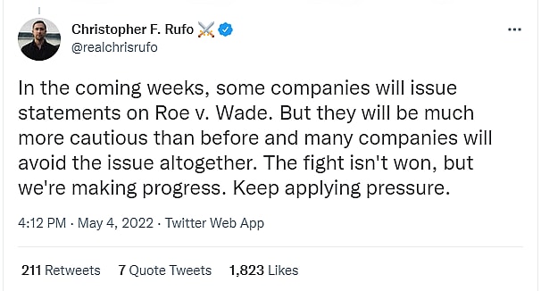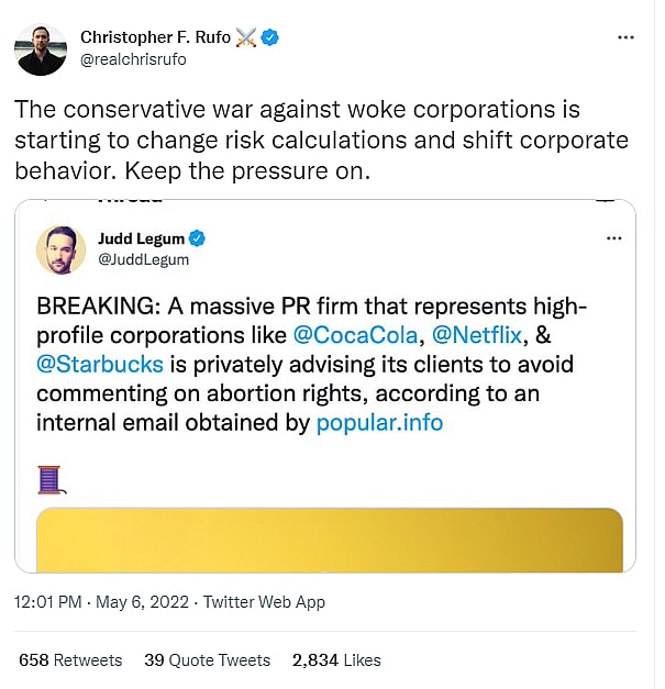Rufo would also respond to a thread from Judd Legum discussing his recent article on Popular Info that claims a giant PR firm is advising their corporate clients to remain mum on the debate regarding the right to life that was recently set ablaze in the media following the circulation of a draft majority opinion by Supreme Court Justice Alito that declares Roe v. Wade will be overturned.