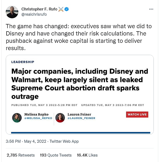 Rufo took to Twitter where he shared a screenshot of a CNBC headline that reads, “Major companies, including Disney and Walmart, keep largely silent as leaked Supreme Court abortion draft sparks outrage.”